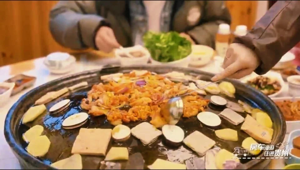 房车之旅在烙锅的香气中暂缓下来,一场凉都灵魂夜宴开启。黑砂凸锅烙万物!盘县火腿滋滋冒油,臭豆腐焦边脆心,蕨粑裹满辣椒面,蘸水是秘制灵魂(折耳根+腐乳+木姜子)。烙尽世间万般滋味,配上刺梨啤酒+《夜郎传奇》实景剧,味觉穿越夜郎古国。